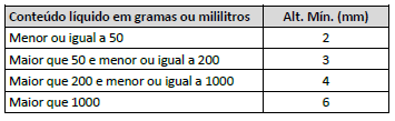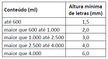 (     ) Tamanho fonte da denominação: no mínimo nas dimensões abaixo, que varia com o conteúdo: