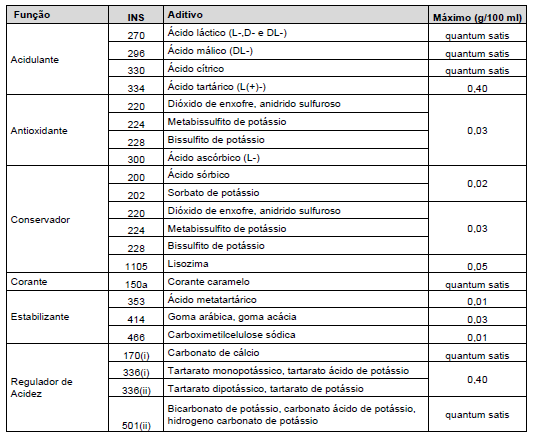 (   ) ADITIVOS: é necessário informar os aditivos alimentares que eventualmente constem no vinho, que devem ser posicionados logo após os ingredientes. Deve ser informado a função do aditivo, que pode ser “Acidulante”, “Antioxidante”, “Conservante” entre outros. Além disto é necessário informar o nome completo do aditivo seguido por seu ou seu código INS, que é o Sistema Internacional de Numeração de Aditivos Alimentares. Importante validar com o importador quais são os aditivos permitidos de acordo com a legislação brasileira, bem como seus limites máximos e condições de uso. Abaixo uma tabela com aditivos alimentares autorizados para uso em vinhos, suas respectivas funções, limites máximos e condições de uso: